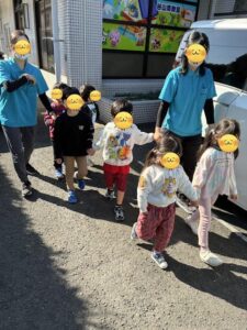 放課後等デイサービスのお兄さん、お姉さんたちに手を繋いでもらって「お・か・し・も・ち」を守りながら歩いて行きます。